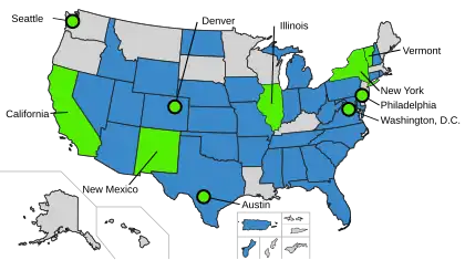 In most jurisdictions, local governments have the ability to pass ordinances, so long as they do not conflict with state law. San Francisco (California), Philadelphia (Pennsylvania), Seattle (Washington), Washington (District of Columbia), Berkeley (California), Cathedral City (California), West Hollywood (California), Austin (Texas), Cleveland (Ohio), New York City, Denver (Colorado),[83] and the US states of Vermont, New Mexico, New York State,[84] Illinois, Rhode Island,[85] Maine,[86] and California - have passed measures mandating that single-occupancy toilets in public spaces be labeled as unisex (or gender-neutral).[87][88][89] In 2022, California enacted legislation allowing cities to build multi-stall gender-neutral bathrooms.[90] Additionally, the 2021 edition of the International Plumbing Code (in use by 35 states, Puerto Rico, Guam, and DC) will require the same as individual states adopt the new edition of the code.[91][92]