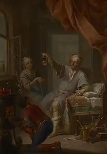 Uroscopy is derived from "Uroscopia," which originates from the Greek word "ouron" meaning "urine," and "skopeo," translating to "behold" or "examine."[1] Records of urinalysis for uroscopy date back as far as 4000 BC, originating with Babylonian and Sumerian physicians.[2] At the outset of the 4th century BC Greek physician Hippocrates hypothesized that urine was a "filtrate" of the four humors, and limited the possible diagnoses resulting from this method to issues dealing with the bladder, kidneys, and urethra.[3] This theory was born from the notion that urine was the liquid residue which moved the humors through the body, and once it had, the urine would exit through the bladder. This implied that because the urine contained a mixture of all four humors, a physician could examine it to accurately decipher the combination of those humors in the body.[4] Another Greek physician, Galen, then refined the idea down to urine being a filtrate of only blood, and not of black bile, yellow bile, or phlegm. Therefore, the development and rapid propagation of uroscopy as the primary procedure for diagnosis hinged on the idea that disease was a result of a humoral imbalance.[1]