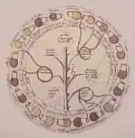 The uroscopy wheel is a diagram that linked the color of urine to a particular disease. It usually has twenty different uroscopy flasks with urine of different colors aligned around the border of the circle. Each flask has a line that connects it to a summary of a particular disease. This allowed doctors to have a quick reference guide to twenty different types of urine.[11]