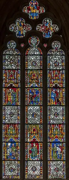 A uroscopy flask, also known as a "matula", is a piece of transparent glass with a thin neck at the top, and a small opening for the patient to urinate in. The bottle is known as a “maftul” in Arabic, which translates to “twisted” due to the shape of the flask’s neck. The translucent quality of the glass is imperative as colorations, along with any deformations, may lead to a misdiagnosis. The bladder-shaped vessel was introduced by Gilles de Corbeil and became a lasting symbol of uroscopy and general medical practice throughout the Middle Ages. Corbeil believed that different parts of the flask correlated to certain parts of the body.[1] Satirists, who mocked the practice for its intent focus on urine as a legitimate medical tool, mocked practitioners by evoking the symbol of the matula. For instance, images of monkeys conducting a uroscopic examination can be found in manuscript marginalia, as well as in an early 14th century stained glass window at York Minster Cathedral.[7]