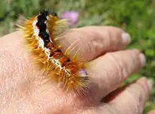If roughly stimulated or held, lasiocampid larvae are likely to writhe and lash about, forcing the stinging bristles into any vulnerable surface they can. Many other species of larvae lack any such localized concentrations of bristles and are armed more generally with urticating hairs; even so, they too will lash about frantically if disturbed, making them difficult to handle without suitable equipment. Toxins from the broken bristles may spill out, causing dermatitis on the surface of the skin.[7] For brown-tail moths (Euproctis chrysorrhoea) native to Europe and invasive in other parts of the world, bristles are shed or broken off during molts and can be wind-borne, so that direct contact with live or dead larvae is not required to trigger a rash.[8]