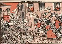 There was great popular irritation with the government's actions in the area of public health, especially with regard to house inspections and disinfections. In the justifications of the petitions sent to the Chamber by workers, the invasion of houses, the demand for residents to leave for disinfection, and the damage caused to domestic utensils were mentioned more than once as a reason for complaints.[31] There was also a certain fear about the vaccine itself, and the opposition sought to give the anti-vaccination campaign a moralistic tone, exploiting the idea of house invasions and offending the fathers' honor by forcing their daughters and wives to undress in front of strangers for the application of the vaccine.[32]