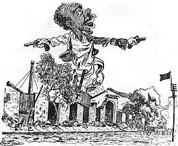 Shortly before the final assault on the Saúde neighborhood, to be carried out by land by the 7th Infantry Battalion and by sea by the battleship Deodoro, Horácio José da Silva, known as Prata Preta, was arrested. A stevedore and practitioner of capoeira, Prata Preta was one of the main and most feared leaders of the revolt, leading the protesters on the barricades of the Saúde neighborhood. Before his arrest, he also killed an Army soldier and wounded two policemen. When he was taken to the police station, he was almost lynched by the soldiers, but the chief of police stopped them. He had to be placed in a straitjacket, and even then he continued to insult and threaten the soldiers.[54] Around three in the afternoon, troopa landed near the Moinho Inglês and took a first trench. The battleship Deodoro then approached, while the Army troops advanced along the Mortona hill. By this time, the trenches had been completely abandoned. It was also verified that the dynamites and cannons were nothing more than a decoy. The first ones were, in fact, pieces of wood wrapped in silver paper, suspended by wires around the trenches, while the cannons were nothing more than a public lighting pipe placed on two wagon wheels.[55]