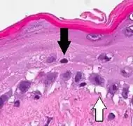 Vacuolar interface dermatitis, with lymphocytes in the dermis and epidermis (black arrow indicates one), and vacuolization (white arrow) at the dermoepidermal junction.