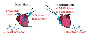 Loewi performed a very simple yet elegant experiment. Using an isolated frog heart he had previously found that stimulation of the vagus nerve resulted in a slowing of the heart rate, while stimulation of the sympathetic nerve caused the heart rate to speed up (Figure 1). He reasoned that stimulation of either the vagus or sympathetic nerve would cause the nerve terminal to release a substance which would either slow or accelerate the heart rate. To prove this, he took a frog heart, which had been cannulated in order to perfuse the fluid surrounding the heart, and electrically stimulated the vagus nerve until the heart rate slowed. He then collected the fluid surrounding the heart and added it to a second frog heart which had been stripped of its vagal and sympathetic nerves. By adding the fluid surrounding the first heart to the second heart, he caused the heart rate of the second heart to slow down. This proved that stimulation of the vagus nerve caused the release of a substance which acted upon the heart tissue and directly caused the heart rate to slow down. (Figure 2) This substance was called vagusstoff. Vagustoff was later confirmed to be acetylcholine and was found to be the principal neurotransmitter in the parasympathetic nervous system.