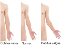 - Elbows: cubitus valgus (from Latin cubitus = elbow) – forearm is angled away from the body.