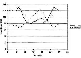 The Valsalva maneuver may be used to arrest episodes of supraventricular tachycardia.[12][13] Blood pressure (BP) rises at onset of straining-because the increased intrathoracic pressure (ITP) is added to the pressure in the aorta. It then falls because the ITP compresses the veins, decreasing the venous return and cardiac output. This inhibits the baroreceptors, causing tachycardia and a rise in peripheral vascular resistance (PVR). When the glottis is opened and the ITP returns to normal, cardiac output is restored, but the peripheral vessels are constricted. The blood pressure therefore rises above normal, and this stimulates the baroreceptors, causing bradycardia and a drop in BP to a normal level.[14]