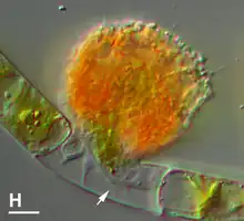 - ↑ Hülsmann N (1983). "On the penetration of algal cell walls during the attacks by vampyrellids". Journal of Protozoology. 30: A50.