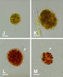 - The immobile but highly metabolically active 'digestive cyst' stage, that appears after the feeding. In some species it is called a 'resting phase', but it is different from a true resting cyst (or spore) that is metabollically inactive to survive adverse conditions. To reach this stage, the trophozoite retracts its filopodia, secretes a layered cell wall, and strongly attaches itself to the substrate or floats freely. Either a central main vacuole or multiple separate vacuoles appear to digest the food. The cytoplasm color may change to a bright red, orange or yellow color, or remain colorless. When the digestive phase is finished, one or multiple trophozoites hatch from the cyst through holes in the cell wall.[3]