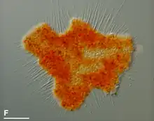 Vampyrellids are traditionally considered filose amoebae, i.e. they generate slender pseudopodia (filopodia). They are naked, devoid of external structures such as scales, cell coats or a glycocalyx, although there may be a temporary mucilage coat in the trophozoite stage. The trophozoites vary greatly in shape, size and color between species, but can be grouped into three cell states or 'morphotypes': isodiametric, expanded, and 'filoflabellate'.[2][3]