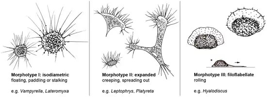 - Isodiametric (spherical) morphotype, common in algivorous Vampyrella and Lateromyxa, with radiating filopodia. Some species float in the water column, resembling heliozoa in shape. Others crawl on the surface by concentrating stiff filopodia at the anterior region of the cell, attaching them to the surface, retracting and moving them towards the posterior region.[3]