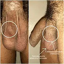 | Varicocele on the person's left testicle. Notice the swelling and slight enlargement of the left testicle, which is marked by an arrow. | |