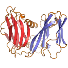 | A ribbon diagram of the DJR-MCP of Pseudoalteromonas virus PM2, with the two jelly roll folds colored in red and blue | |