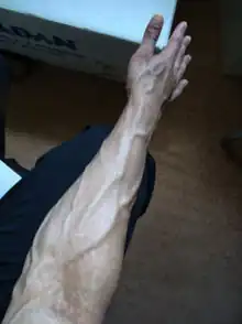 Vascularity, in bodybuilding, is the condition of having many highly visible, prominent, and often extensively-ramified superficial veins.[1] The skin appears "thin"—sometimes virtually transparent—due to an extreme reduction of subcutaneous fat, allowing for maximum muscle definition.