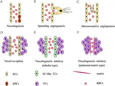 - ↑ Pezzella, Francesco; Ribatti, Domenico (December 2022). "Vascular co-option and vasculogenic mimicry mediate resistance to antiangiogenic strategies". Cancer Reports. 5 (12): e1318. doi:10.1002/cnr2.1318. ISSN 2573-8348. PMC 9780428. PMID 33295149.