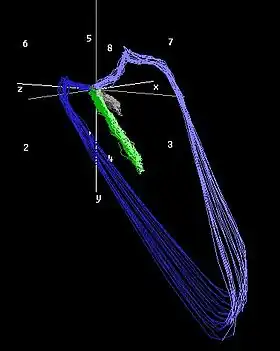 Vectorcardiography was developed by E. Frank in the mid 1950s.[2][3] Since the human body is a three-dimensional structure, the basic idea is to construct three orthogonal leads containing all the electric information. The three leads are represented by right-left axis (X), head-to-feet axis (Y) and front-back (anteroposterior) axis (Z).