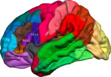 Specific functional distinctions have been presented between the three Brodmann subregions of the VLPFC.[1][2][3] There are also specific functional differences in activity in the right and left VLPFC.[4] Neuroimaging studies employing various cognitive tasks have shown that the right VLPFC region is a critical substrate of control.[4] At present, two prominent theories feature the right VLPFC as a key functional region. From one perspective, the right VLPFC is thought to play a critical role in motor inhibition, where control is engaged to stop or override motor responses.[5] Alternatively, Corbetta and Shulman[2][6][7] have advanced the hypothesis that there are two distinct frontoparietal networks involved in spatial attention, with the right VLPFC being a component of a right-lateralized ventral attention network that governs reflexive reorienting. From this perspective, the right lateral PFC, along with a region spanning the right temporoparietal junction (TPJ) and the inferior parietal lobule, are engaged when abrupt onsets occur in the environment, suggesting that these regions are involved in re-orienting attention to perceptual events that occur outside the current focus of attention.[4] Also, the VLPFC is the end point of the ventral pathway (stream) that brings information about the stimuli's characteristics.[8]