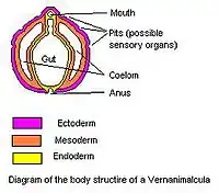 The Vernanimalcula fossils were interpreted as showing a triploblastic structure, a coelom, a differentiated gut, a mouth, an anus, and paired external pits that were believed possible sense organs, making it the earliest known member of the Bilateria (animals with bilateral symmetry, at least as embryos).