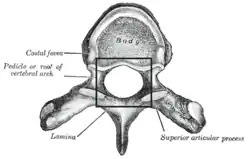 ![]() A typical thoracic vertebra, viewed from above. (Vertebral foramen is the large hole at the center.) | |
