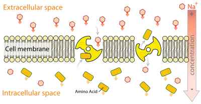 The active transport of monoamines from the cytosol into storage vesicles operates against a large (>105) concentration gradient. Secondary active transport is the type of active transport used, meaning that VMAT1 is an antiporter. This transport is facilitated via proton gradient generated by the protein proton ATPase. The inward transport of the monoamine is coupled with the efflux of two protons per monoamine.[12] The first proton is thought to cause a change in VMAT1's conformation, which pushes a high affinity amine binding site, to which the monoamine attaches. The second proton then causes a second change in the conformation which pulls the monoamine into the vesicle and greatly reduces the affinity of the binding site for amines. A series of tests suggest that His419, located between TMDs X and XI, plays the key role in the first of these conformational changes, and that Asp431, located on TMD XI, does likewise during the second change.[9]