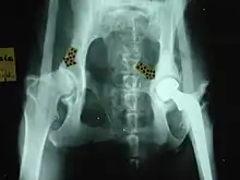 X-ray of a dog with an artificial hip to repair hip dysplasia
