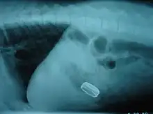 A variety of non-edible objects are commonly swallowed by dogs, cats, and cattle. These foreign bodies can cause obstruction of the gastrointestinal tract causing severe vomiting and resulting electrolyte imbalances. The stomach (gastrotomy) or intestine (enterotomy) can be surgically opened to remove the foreign body. Necrotic intestine can be removed (enterectomy) and repaired with intestinal anastomosis. Foreign bodies can also be removed by endoscopy, which although requires general anesthesia does not require surgery and significantly decreases recovery time.[19] However, endoscopic foreign body retrieval is anatomically limited to objects lodged in the esophagus, the stomach or the colon. The condition in cattle is known as hardware disease.