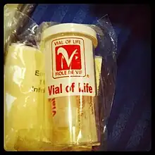The Vial of Life (French: Fiole de vie),[1][2] also known as Vial of L.I.F.E. (Lifesaving Information for Emergencies), is a program that allows individuals to have their complete medical information readily available in their homes for emergency personnel to reference during an emergency. The program provides the patient's medical information when the patient is unable to speak or remember it. Vial of Life programs are commonly used by senior citizens and promoted by senior center organizations,[3] fire departments, and other community organizations.[4]