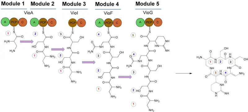 - VioA: NRPS (A-PCP-C-A-PCP-C)