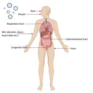 Viruses causing disease in humans often enter through the mouth, nose, genital tract, or through damaged areas of skin, so cells of the respiratory, gastrointestinal, skin and genital tissues are often the primary site of infection.[2][7][4] Some viruses are capable of transmission to a mammalian fetus through infected germ cells at the time of fertilization, later in pregnancy via the placenta, and by infection at birth.[2]