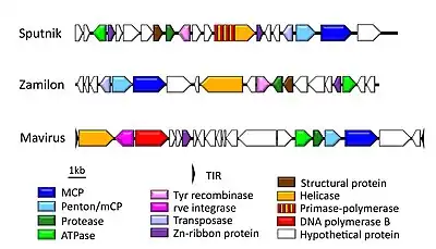 Genome representation of the virophages Sputnik, Zamilon, and Mavirus. Homologous genes are colored identically.[14]