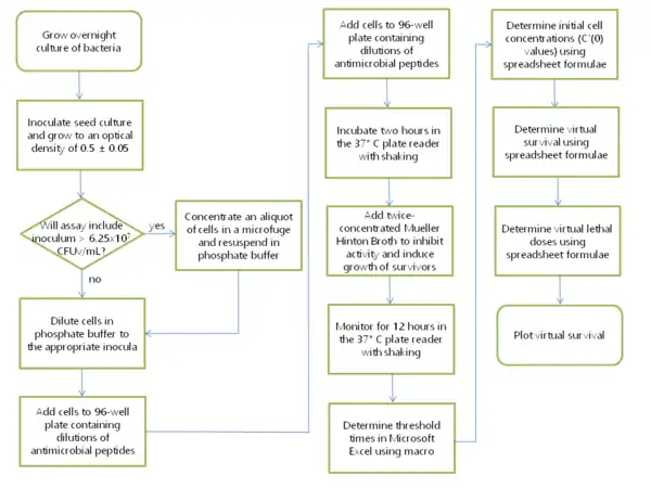 A 2 mL bacterial culture is inoculated from a single colony and grown overnight in Phosphate Mueller Hinton (PMH) or Phosphate Mueller Hinton Tryptic Soy Broth (PMHT) media. PMH is a 1:1 mixture of Mueller Hinton Broth and 10 mM sodium phosphate pH 7.4. Either cation-adjusted or non-cation-adjusted MHB may be used. In some experiments, 1% Tryptic Soy Broth (TSB) was present in the phosphate buffer to enhance defensin activity during the two hour incubation; in this case the analogous 1:1 mixture of buffer and broth contained 0.5% TSB and is called PMHT. 250 μl of this culture is transferred to 25 mL of PMH in a 125 mL disposable filter flask. This culture is grown at 37 °C shaking 250 rpm typically 2–3 hours until the optical density of the culture at 650 nm is between 0.45 and 0.55. Meanwhile, antimicrobial peptides are diluted on a 96-well plate (Costar 3595, which are tissue culture-treated) in 10 mM sodium phosphate pH 7.4 such that the final volume is 90 microliters. Virtual colony forming units, or CFUv, is defined in the original VCC publication[1] and its definition is repeated here: CFUv was held constant among the six strains tested so that the turbidity, and thus the amount of cell membrane, in each experiment was roughly equal. Because CFUv was standardized to the CFU of Escherichia coli ATCC 25922, CFU, not CFUv, can be reported with this strain. For the experimental portion of the assay, cells are diluted in 10 mM sodium phosphate pH 7.4 such that the final cell concentration in 10 microliters is 5x106 CFUv/mL. 10 μl of this cell suspension are pipetted beneath the 90 μl of antimicrobial peptides in solution, resulting in a cell suspension at the standard inoculum of 5x105 CFUv/mL during the exposure of cells to antimicrobial peptides. Several wells of the 96-well plate are used for controls exposed to no antimicrobial agent; these are termed the "output" controls. The 96-well plate was then incubated two hours in the plate reader, set to shake and take readings every five minutes. During this incubation time, the seed culture was kept on ice. For a calibration curve, 1 mL of seed culture was added to 1.5 mL of PMH after the two hour incubation to generate a suspension of 108 CFUv/mL. A 10-fold dilution series of this suspension was made ranging from 107 to 100 CFUv/ml in 200 μl total volume of PMH, occupying eight wells of the 96-well plate. At this time, cells exposed to no antimicrobial agent were added to several wells of the plate from the culture kept on ice; these are termed the "input" controls, since they indicate the number of cells present at the start of the two hour incubation. In the initially published VCC experiments [1] only the internal 60 wells of the plate were used, since evaporation changed the volume of the edge wells during the 12-hour incubation. However, all 96 wells of the 96-well plate can be used for the experiment as long as the edge of the plate is wrapped with a piece of Parafilm M six squares long by one half square wide. The gas-permeable Parafilm retards evaporation while allowing cellular respiration and preventing particulate matter from being blown into the 96-well plate in the plate reader. Once the plate is wrapped with Parafilm, it is transferred from the biosafety cabinet to the plate reader. Several models of temperature-controlled plate readers have successfully been used in VCC assays, including a Molecular Devices Vmax kept in a warm room, a Molecular Devices Spectramax, and a Tecan Infinite M1000. The plate reader is set to read optical density at 650 nm every 5 minutes for 12 hours, shaking before each reading. Raw data is imported into Microsoft Excel, where the macro VCC Calculate is run to determine the time required for each growth curve to reach a threshold optical density of 0.02.