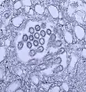 TEM is a specialized type of microscopy that utilizes a beam of electrons focused with a magnetic field to image a sample. TEM provides imaging with 1000x greater spatial resolution than a light microscope (resolution down to 0.2 nm).[33] An ultrathin, negatively stained sample is required. Sample preparations involve depositing specimens onto a coated TEM grid and negative staining with an electron-opaque liquid.[34] Tissue embedded samples can also be examined if thinly sectioned. Sample preparations vary depending on protocol and user but generally require hours to complete. TEM images can show individual virus particles and quantitative image analysis can be used to determine virus concentrations. These high resolution images also provide particle morphology information that most other methods cannot. Quantitative TEM results will often be greater than results from other assays as all particles, regardless of infectivity, are quantified in the reported virus-like particles per mL (vlp/mL) result. Quantitative TEM generally works well for virus concentrations greater than 106 particles/mL. Because of high instrument cost and the amount of space and support facilities needed, TEM equipment is only available in a few laboratories.