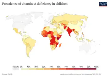 Globally, VAD is estimated to affect about one-third of children under the age of five, causing an estimated 670,000 deaths in children under five annually.[8][9] It is most prevalent in sub-Saharan Africa (48 percent) and South Asia (44 percent).[8] Although VAD is well-managed in many high income nations, it remains a significant concern in resource-poor settings. Public health interventions, such as vitamin A supplementation, reached 59% of targeted children in 2022, highlighting the ongoing need for comprehensive efforts to combat VAD.[8]