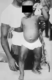Although rickets and osteomalacia are now rare in Britain, osteomalacia outbreaks in some immigrant communities included women with seemingly adequate daylight outdoor exposure wearing typical Western clothing.[29] Having darker skin and reduced exposure to sunshine did not produce rickets unless the diet deviated from a Western omnivore pattern characterized by high intakes of meat, fish, and eggs and low intakes of high-extraction cereals.[30][31][32] In sunny countries where rickets occurs among older toddlers and children, rickets has been attributed to low dietary calcium intakes. This is characteristic of cereal-based diets with limited access to dairy products.[32] Rickets was formerly a major public health problem among the US population; in Denver, almost two-thirds of 500 children had mild rickets in the late 1920s.[33] An increase in the proportion of animal protein in the 20th-century American diet coupled with increased consumption of milk fortified with relatively small quantities of vitamin D coincided with a dramatic decline in the number of rickets cases.[34][35][36] One study of children in a hospital in Uganda, however, showed no significant difference in vitamin D levels of malnourished children compared to non-malnourished children. Because both groups were at risk due to darker skin pigmentation, both groups had vitamin D deficiency. Nutritional status did not appear to play a role in this study.[37]
