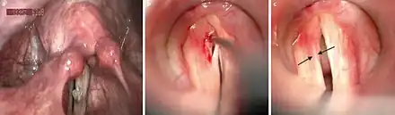{{cite book}}: CS1 maint: multiple names: authors list (link) - ↑ J, Bohlender (2013). "GMS | GMS Current Topics in Otorhinolaryngology - Head and Neck Surgery | Diagnostic and therapeutic pitfalls in benign vocal fold diseases". GMS Current Topics in Otorhinolaryngology, Head and Neck Surgery. 12: Doc01. doi:10.3205/cto000093. PMC 3884536. PMID 24403969.