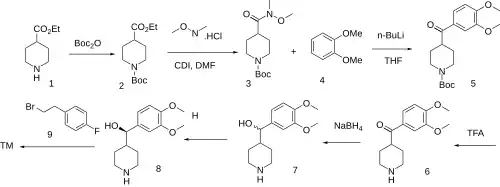 The protection of Ethyl isonipecotate [1126-09-6] (1) with Boc anhydride gives ethyl n-boc-4-piperidinecarboxylate [142851-03-4] (2). Ester-amide interchange with N-Methoxymethylamine HCl: [6638-79-5] in the presence of CDI coupling agent gives 1-Boc-4-[methoxy(methyl)carbamoyl]piperidine [139290-70-3] (3). Weinreb ketone synthesis occurs upon benzoylation with 1,2-Dimethoxybenzene [91-16-7] (4) to give 1-Boc-4-(3,4-dimethoxybenzoyl)piperidine, [2322526-86-1] CID:139510111 (5). Acid removal of the urethane protecting group gives (3,4-dimethoxyphenyl)-piperidin-4-ylmethanone [742665-98-1] (6). The reduction of the ketone with sodium borohydride leads to (3,4-Dimethoxyphenyl)-piperidin-4-ylmethanol, CID:24261124 (7). Resolution of the alcohol gives (8). Sn2 alkylation of the secondary nitrogen with 4-Fluorophenethyl bromide [332-42-3] (9) completed the synthesis of Volinanserin (10).