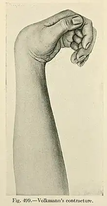 It is named after Richard von Volkmann (1830–1889), the 19th century German doctor who first described it,[4] in a paper on "non-Infective Ischemic conditions of various fascial compartments in the extremities".[5] Because the contracture occurred at the same time as the paralysis, he considered a nerve cause to be unlikely.[6]