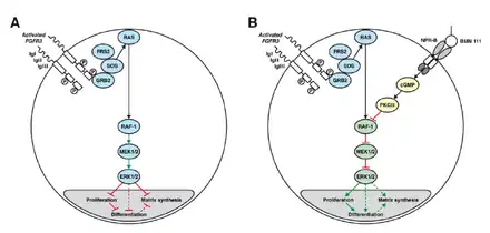 This article incorporates text from this source, which is in the public domain. - 1 2 3 Lorget F, Kaci N, Peng J, Benoist-Lasselin C, Mugniery E, Oppeneer T, et al. (December 2012). "Evaluation of the therapeutic potential of a CNP analog in a Fgfr3 mouse model recapitulating achondroplasia". American Journal of Human Genetics. 91 (6): 1108–14. doi:10.1016/j.ajhg.2012.10.014. PMC 3516592. PMID 23200862.