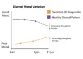 Mood fluctuations are currently thought to be dependent on circadian processes. A typical healthy individual without a mood disorder shows circadian-locked fluctuations in mood, with positive mood beginning right after the morning awakening, and decaying as the day goes on during prolonged wakefulness. A typical individual with depression will show the opposite mood fluctuation cycle, with a low mood right after morning awakening, which gradually becomes more positive with prolonged wakefulness. These circadian-locked changes across the day are referred to as "diurnal" variations in mood. Evidence across many sleep deprivation studies suggests that an individual's diurnal mood fluctuations can be used to predict whether they will respond to sleep deprivation therapy.[30] Individuals with depression who show the typical low morning mood that increases throughout the day are more likely to respond positively to sleep deprivation than individuals who show mood fluctuations that deviate from the typical pattern.[30] One caveat to these findings is that a single individual may show diurnal fluctuations that vary day-to-day, showing typical diurnal changes on one day while not showing any changes (constant mood) on the next. This complexity was addressed in studies that followed single individuals and administered repeated sleep deprivation on days when the individual showed different mood fluctuations. The studies showed that an individual's ability to show the typical mood fluctuations was a better predictor of whether they would respond to sleep deprivation treatment than the individual's mood state on the particular day that they underwent sleep deprivation.[30]
