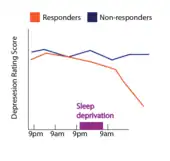Responsiveness to sleep deprivation is also currently believed to be dependent on observable pattern in a person's regular sleep cycle, such as how quickly a person enters into a sleep cycle called rapid eye movement (REM) sleep.[31] Individuals with depression typically show abnormally short REM sleep onsets, meaning they enter into the REM sleep stage earlier in the course of the night than matched healthy controls. Individuals with depression who have short-latency REM sleep typically respond to sleep deprivation therapy more often than individuals with depression who do not show the typical short latency REM sleep pattern.[31]