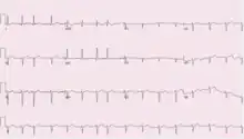 Wandering atrial pacemaker (WAP) is an atrial rhythm where the pacemaking activity of the heart originates from different locations within the atria.[1] This is different from normal pacemaking activity, where the sinoatrial node (SA node) is responsible for each heartbeat and keeps a steady rate and rhythm. Causes of wandering atrial pacemaker are unclear, but there may be factors leading to its development. It is often seen in the young, the old, and in athletes, and rarely causes symptoms or requires treatment.[2] Diagnosis of wandering atrial pacemaker is made by an ECG.