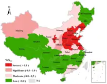 Some academics propose a separate type of water scarcity termed ecological water scarcity[21] though some publications argue that this falls within the definition of physical water scarcity.[17][4] It would focus on the water demand of ecosystems, referring to the minimum quantity and quality of water discharge needed to maintain sustainable and functional ecosystems. Results from a modelling study in 2022 show that northern China suffered more severe ecological water scarcity than southern China. The driving factor of ecological water scarcity in most provinces was water pollution rather than human water use.[21]