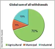 Until recently, groundwater was not a highly used resource. In the 1960s, more and more groundwater aquifers developed.[71] Improved knowledge, technology and funding have made it possible to focus more on drawing water from groundwater resources instead of surface water. These made the agricultural groundwater revolution possible. They expanded the irrigation sector which made it possible to increase food production and development in rural areas.[72] Groundwater supplies nearly half of all drinking water in the world.[73] The large volumes of water stored underground in most aquifers have a considerable buffer capacity. This makes it possible to withdraw water during periods of drought or little rainfall.[32] This is crucial for people that live in regions that cannot depend on precipitation or surface water for their only supplies. It provides reliable access to water all year round. As of 2010, the world's aggregated groundwater abstraction is estimated at 1,000 km3 per year. Of this 67% goes on irrigation, 22% on domestic purposes and 11% on industrial purposes.[32] The top ten major consumers of abstracted water make up 72% of all abstracted water use worldwide. They are India, China, United States of America, Pakistan, Iran, Bangladesh, Mexico, Saudi Arabia, Indonesia, and Italy.[32]