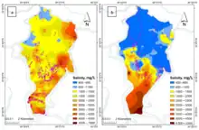 In general, the groundwater salinity increases from north to south in the country. But even within small areas, the groundwater salinity can vary a lot.[25]