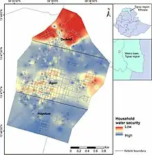 Despite the wide-reaching piped water network, households and small businesses in Wukro remain water insecure to different degrees, primarily due to the unreliable and intermittent flow of water through the pipes. In Wukro, residents experience water insecurity and vulnerability to endemic drought.[17]