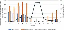 Water in Wukro has been a scarce resource due to urban population growth, construction, and the seasonality of water availability.[42] Climate variability is a driver of water access in Wukro, with greater access to water during the wet season, particularly July to September. In the dry season, around 43%–45% of households rely solely on piped water to meet domestic water needs, which is mostly supplemented with buying water. In the wet season, just over half of households rely on piped water only for drinking and cooking, while rainwater is used widely for washing clothes, cleaning and bathing; a smaller proportion of households still rely on bought water for drinking and cooking.[17]