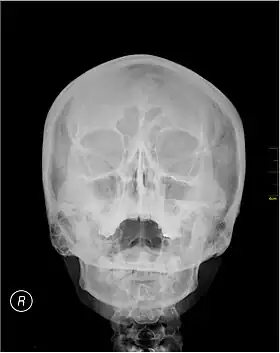 ![]() A Waters' view radiograph showing the paranasal sinuses | |
