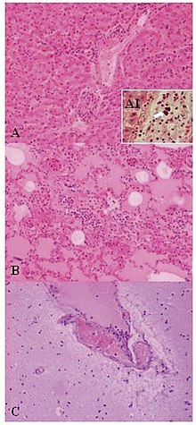 | Lesions of Weissella confusa in the mona monkey (hematoxylin and eosin stain): A) liver: portal triads with neutrophilic infiltration (x10); A1, presence of bacterial emboli inside the vein (arrow) (x40). B) acute pneumonia: edema, congestion, and leukocyte cells exudation in the pulmonary alveoli (x10). C) encephalitis: congestion and marginalized neutrophils in nervous vessels (x10) | |