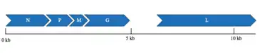 The WCBL contains a linear genome that is 12,278 base pairs in length and comprises five main genes, denoted N, P, M, G, and L. Gene N encodes for the nucleoprotein, P encodes for the phosphoprotein, M encodes for matrix proteins, G encodes for the glycoprotein, and L encodes for the polymerase.[8] WCBL must encode for an RNA-dependent RNA polymerase (RdRp) in its genome in order for viral replication and synthesis to occur because it is a negative single-strand RNA virus. In comparison to other lyssaviruses, WCBL has a shorter trailer region of 57 nucleotides (as opposed to 69–70), but a longer non-coding region specifically in the glycoprotein gene at 697 nucleotides.[9] These differences have resulted in its classification into its own phylogroup. The West Caucasian bat lyssavirus also contains an open reading frame within the G gene which led researchers to believe parts of the glycoprotein were transcribed independently. However, a lack of a transcription initiation signal near the internal open reading frame has since confirmed that the glycoprotein is not transcribed in separate segments.[9]