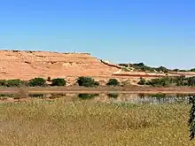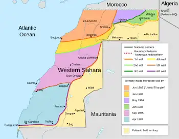 The Moroccan and Mauritanian annexations were resisted by the Polisario Front, which had gained backing from Algeria.[33] It initiated guerrilla warfare and, in 1979, Mauritania withdrew due to pressure from Polisario, including a bombardment of its capital and other economic targets. Morocco extended its control to the rest of the territory. It gradually contained the guerrillas by setting up the extensive sand-berm in the desert (known as the Border Wall or Moroccan Wall) to exclude guerrilla fighters.[34][35] Hostilities ceased in a 1991 cease-fire, overseen by the peacekeeping mission MINURSO, under the terms of a UN Settlement Plan.